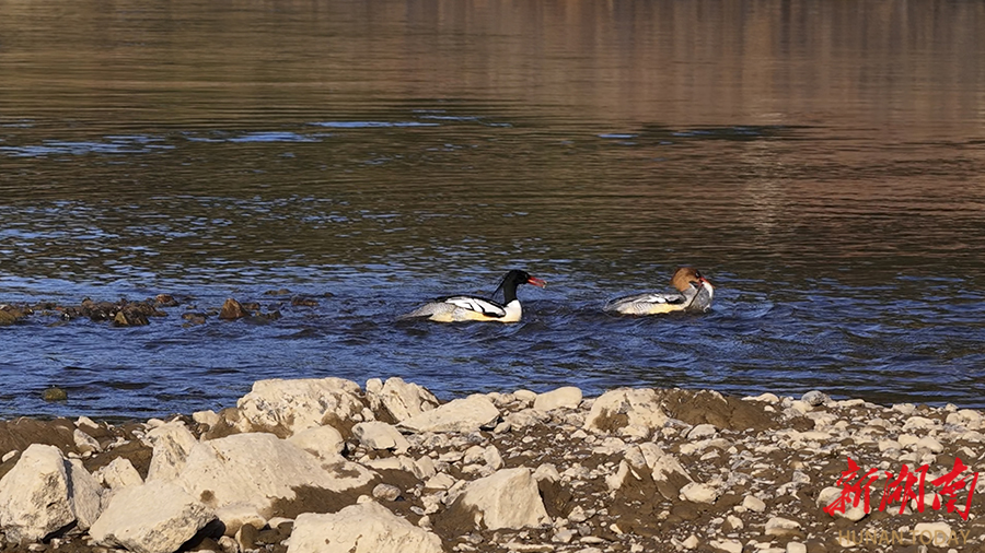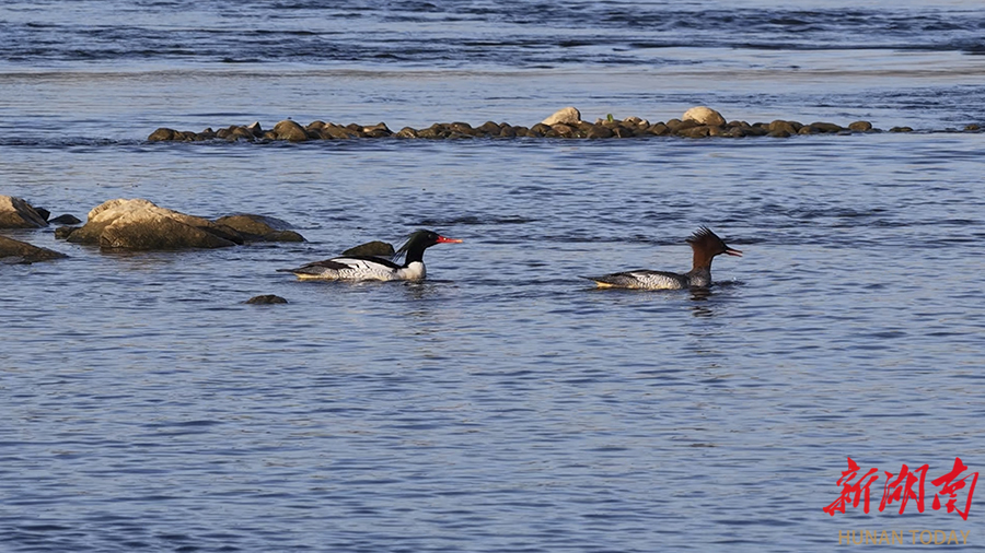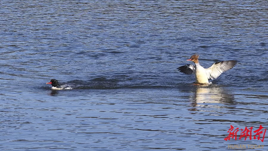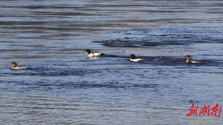 11月29日,湖南桃江羞女湖国家湿地公园,中华秋沙鸭在嬉戏、觅食。中华秋沙鸭是国家一级保护动物,被列入《国家重点保护野生动物名录》。今年是中华秋沙鸭连续12年在此越冬,成为当地生态保护的亮丽名片。 熊朝阳 摄(湖南图片库)