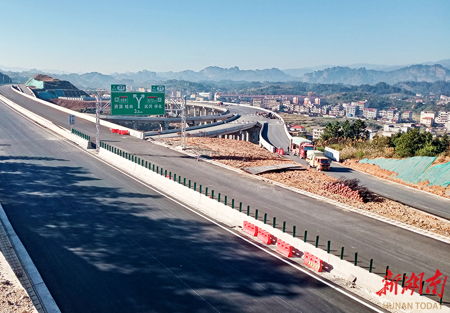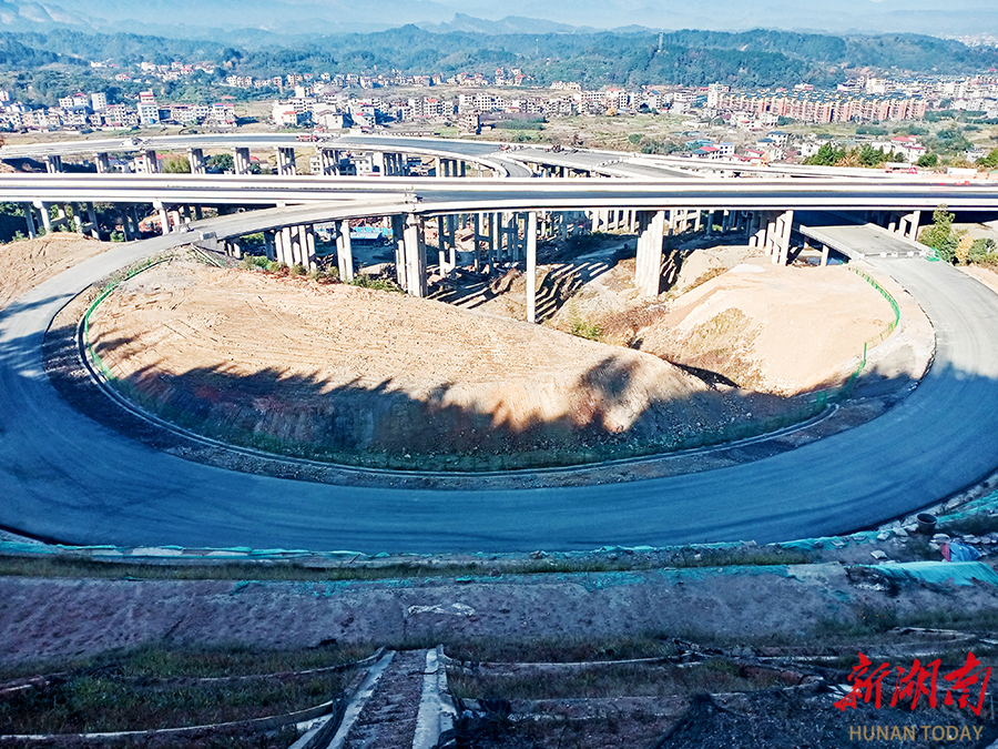 11月30日,新宁县金石镇水头村,新(化)新(宁)高速公路二标段互通进入扫尾施工。目前,该段路基、路面等主体工程已完成,预计年底通车,将大幅改善区域交通条件。 石国兴 摄(湖南图片库)