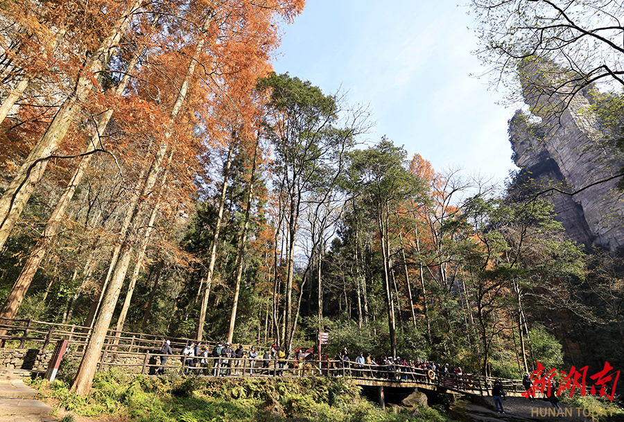 11月30日,游人在张家界国家森林公园金鞭溪景区游览。冬日的家森林公园风和日丽,游客们漫步山水间,尽情享受亲近自然的冬日休闲时光。 吴勇兵 摄(湖南图片库)
