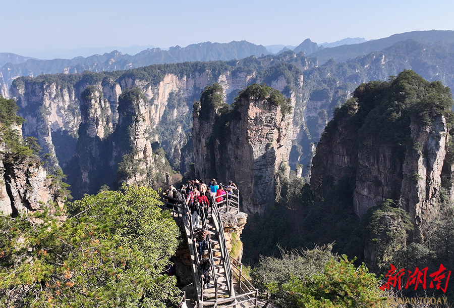 11月30日,游人在张家界国家森林公园黄石寨景区游览。冬日的家森林公园风和日丽,游客们漫步山水间,尽情享受亲近自然的冬日休闲时光。 吴勇兵 摄(湖南图片库)