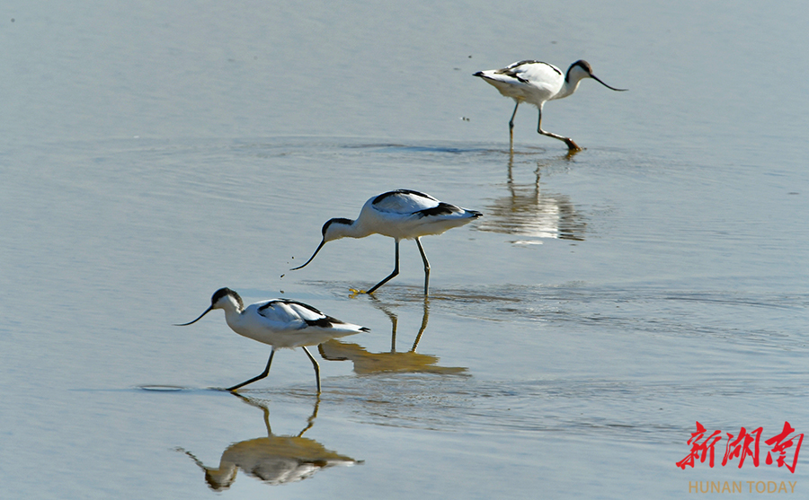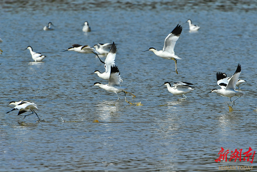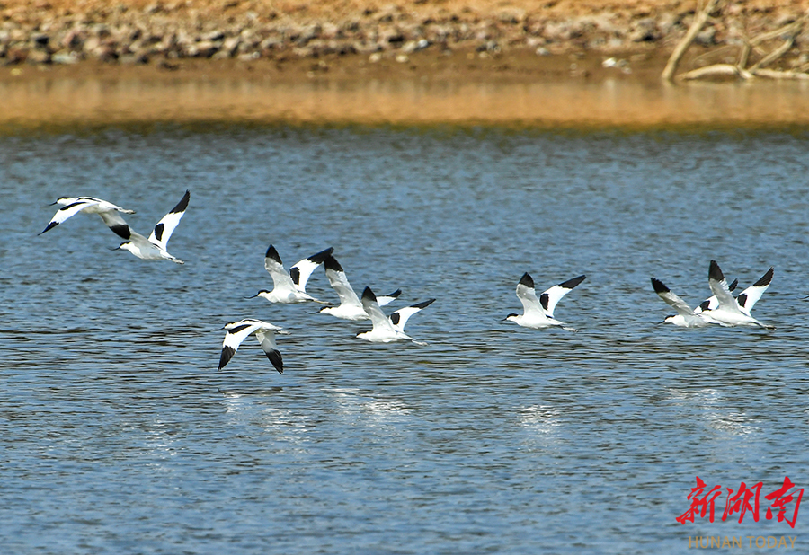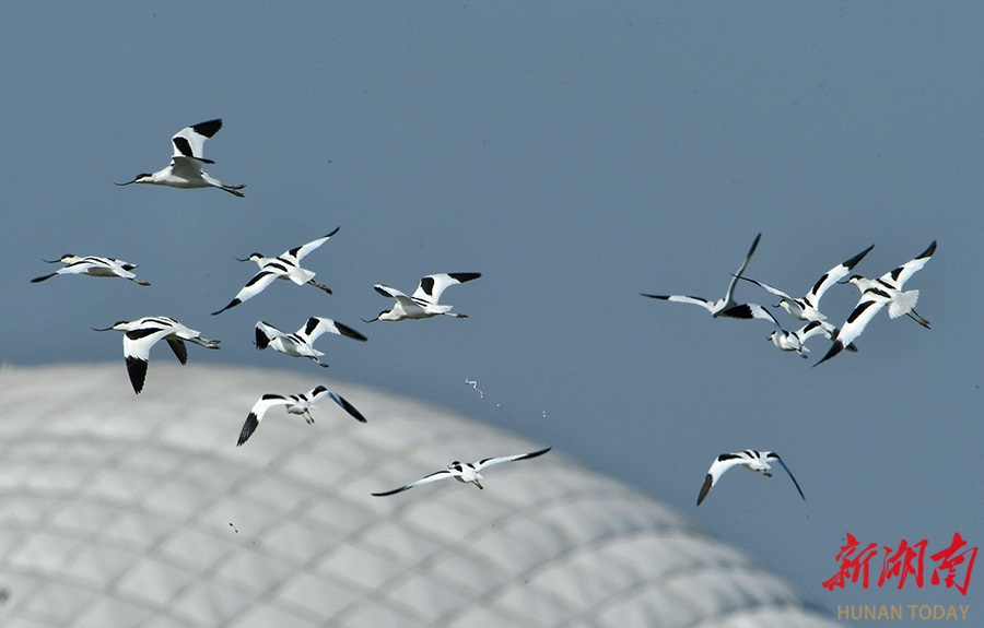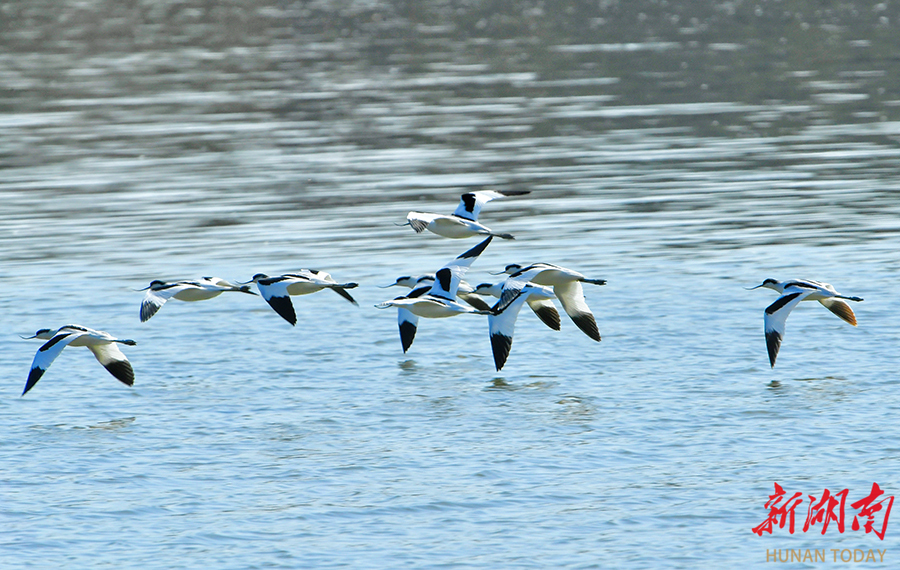 11月30日,湘阴县三塘镇,反嘴鹬在湿地飞翔。这种喙部独特上翘的候鸟,通常在浅水区用其特殊嘴型搜寻小型水生生物极为独特。 湖南日报全媒体记者 徐行 摄