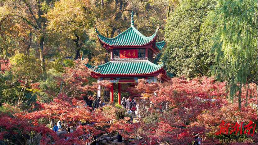 The photo, taken on November 30, shows the scenery of red maple leaves near the Aiwan Pavilion at the Yuelu Mountain Scenic Area, Changsha City. Maple leaves here have turned red, entering their best viewing period. Aiwan Pavilion, one of China's Four Famous Pavilions, is now surrounded by fiery red maples, creating a breathtaking scene that attracts numerous tourists. (Photo/Gu Pengbo, Hunan Daily)