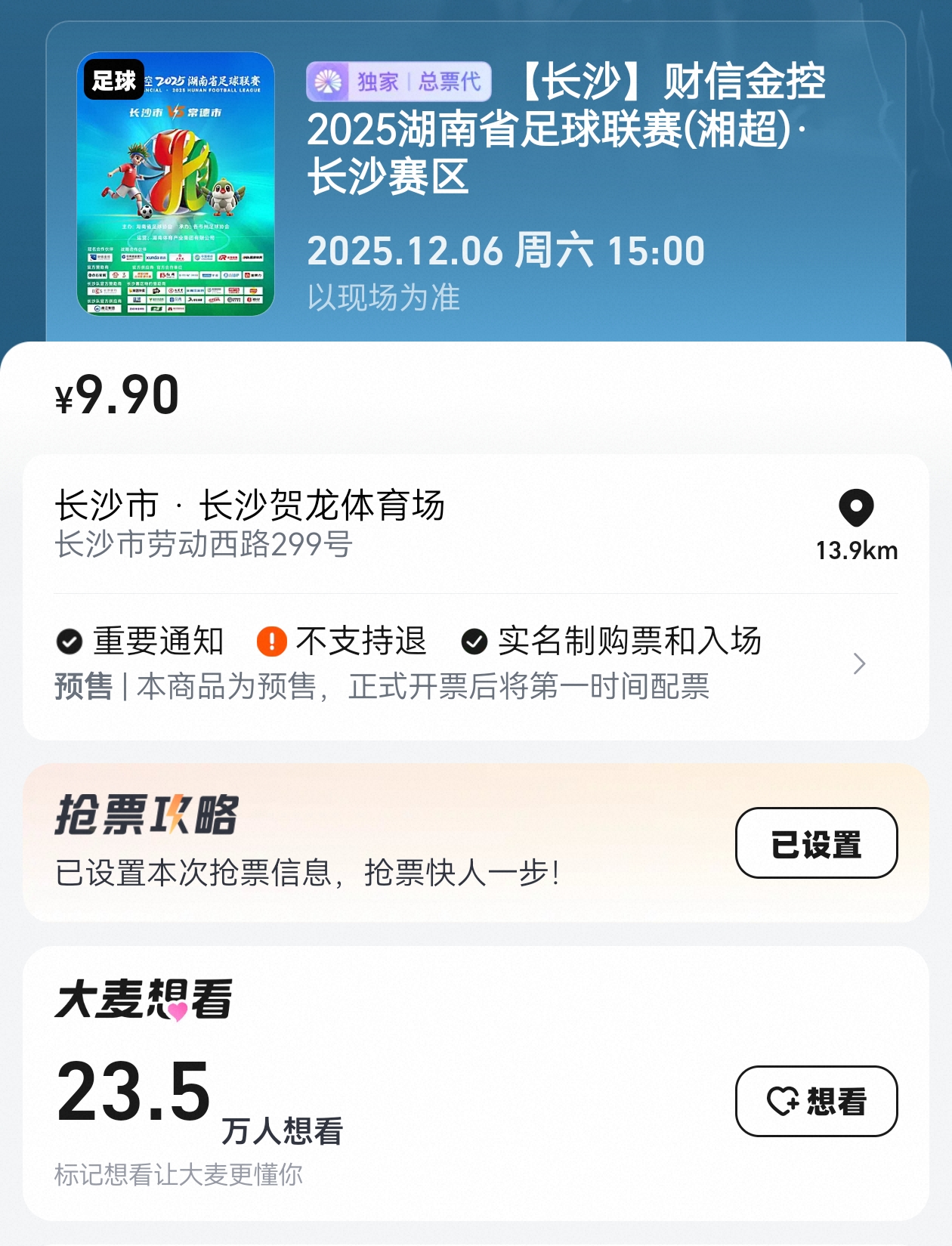 湖南日报·新湖南客户端12月1日讯(记者 肖霄)12月6日(周六)15:00,湘超联赛常规赛最后一轮,长沙队将主场迎战常德。大麦平台已开启票务预约,想看人数达23.5万。正式开票时间为12月3日(周三)18:00,快来大麦预约抢票吧!