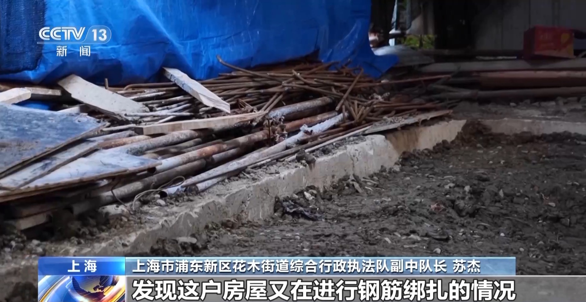 上海市浦东新区花木街道综合行政执法队副中队长 苏杰:因为现实的客观情况,我们是无法做到每日对每一套房屋进行巡查。一直到10月27日的时候,发现这户房屋又在进行钢筋绑扎的情况,我们当时就要求再次责令停止施工。到11月12日的时候,我们接到热线投诉工单,到现场发现有铺设钢筋这个情况,现场立即要求停止施工,并且发现他的整改恢复时效比较缓慢,所以随即进行立案处理。