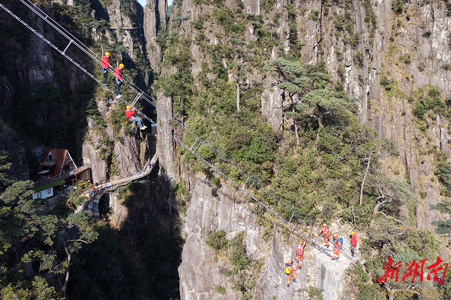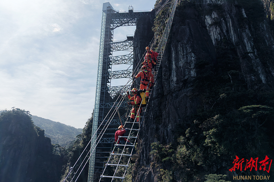 11月27日,郴州市宜章县消防救援大队与莽山五指峰景区联合开展“太空天梯”高空救援实战演练。景区与消防部门协同完成速降救援、伤员转运等科目,有效提升特殊地形应急救援能力。 骆静 周杰纯 陈传敏 摄影报道(湖南图片库)