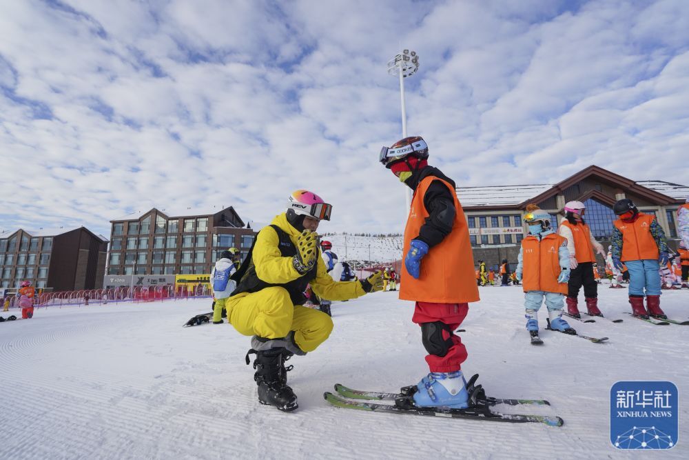 ↑ 学生在阿勒泰将军山国际滑雪度假区学习滑雪技巧。 新华社记者 阿曼 摄