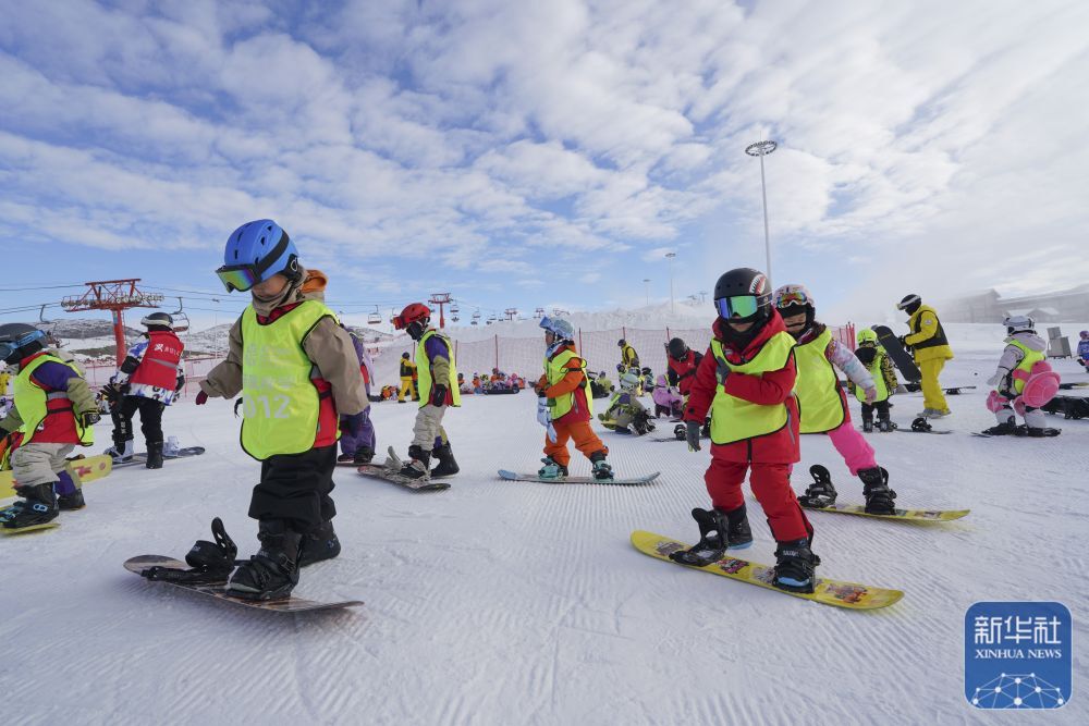 ↑ 学生在阿勒泰将军山国际滑雪度假区练习单板滑雪。 新华社记者 阿曼 摄