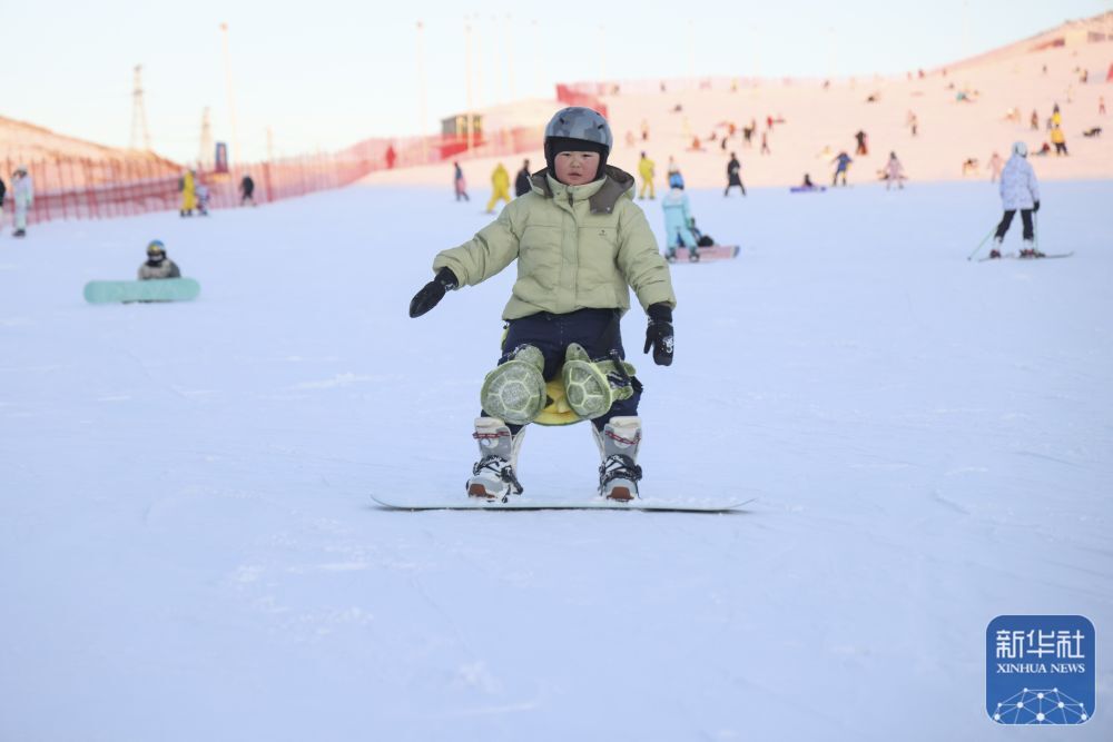 ↑ 一名小学生在阿勒泰将军山国际滑雪度假区滑雪。 新华社发(明庭俊杰摄)