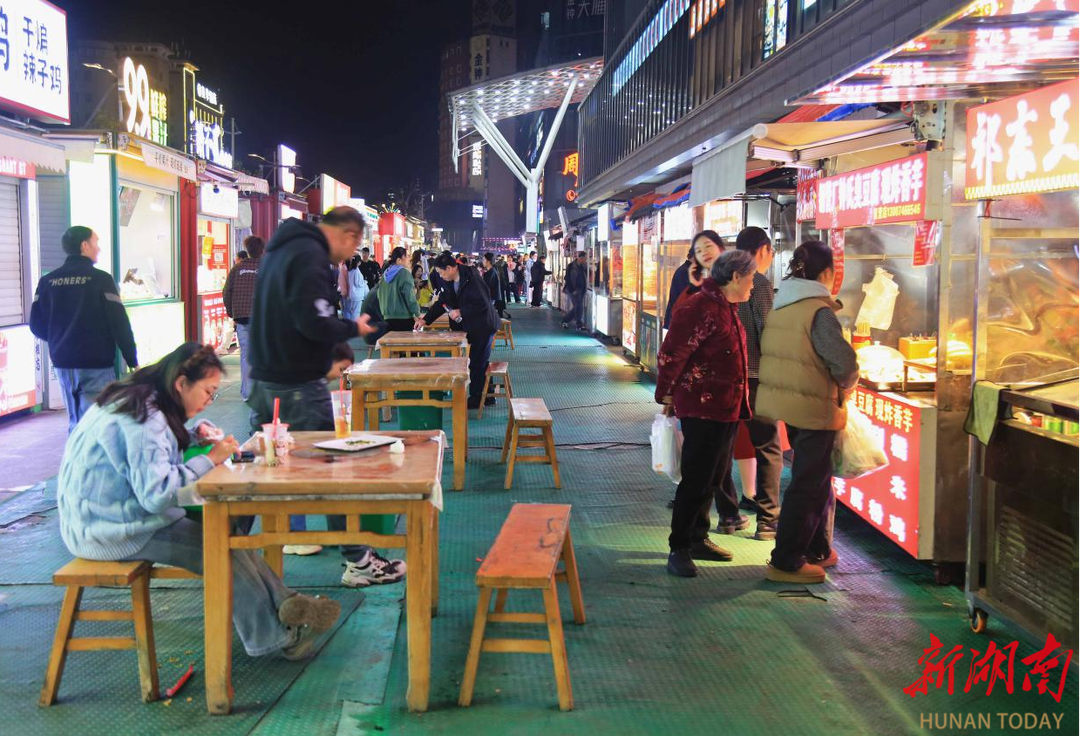 南华里夜经济示范街烟火气十足。它地处蒸湘中心,串联三大商圈,金钟大雁城、融冠乐街、弘阳广场入选省级夜间消费聚集示范区。依托“蒸湘畅晚”品牌,这里培育多元业态,200多个摊位客流高峰达5000人。今年“五一”,金钟大雁城客流破40万,弘阳广场单日客流超10万,消费活力凸显。
