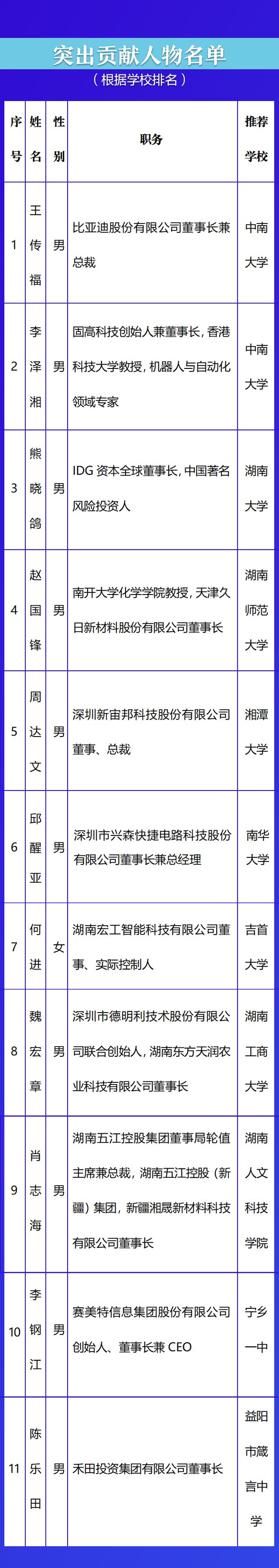 12月2日下午,2025年“校友回湘”大会在长沙召开。大会设立了“突出贡献人物”和“招引大使”两项荣誉,比亚迪股份有限公司董事长兼总裁王传福等11人被授予“突出贡献人物”称号,中南大学校友企业家联谊会执行理事长卫华诚等10人被评为“校友回湘”招引大使。具体获奖名单如下: