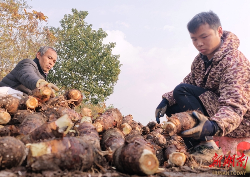 12月2日,祁东县砖塘镇槟榔芋种植基地,村民在整理、清洁槟榔芋。初冬时节,当地种植的槟榔芋进入采收季,村民们趁着晴好天气采挖、分拣、打包、转运槟榔芋,在满足市场需求的同时,实现农闲时节就近就业增收。曹正平 唐瑜琦 摄影报道(湖南图片库)