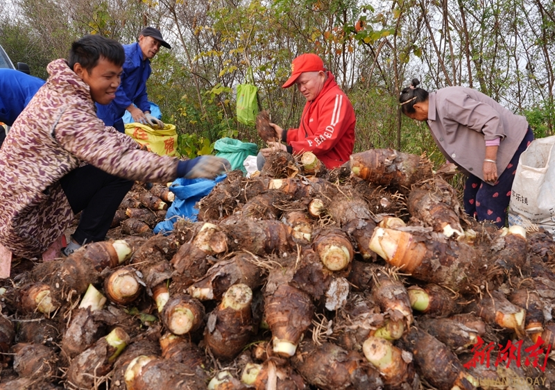 12月2日,祁东县砖塘镇槟榔芋种植基地,村民在采收槟榔芋。初冬时节,当地种植的槟榔芋进入采收季,村民们趁着晴好天气采挖、分拣、打包、转运槟榔芋,在满足市场需求的同时,实现农闲时节就近就业增收。曹正平 唐瑜琦 摄影报道(湖南图片库)
