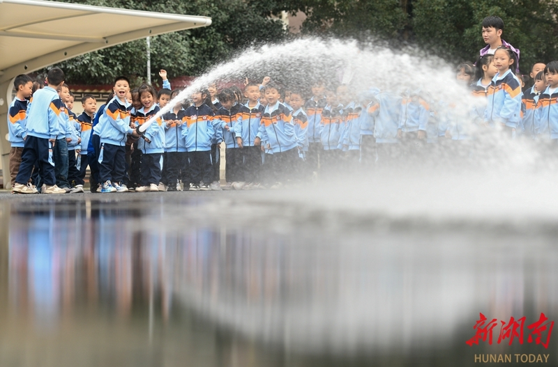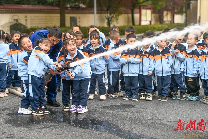 12月2日,小朋友在消防员指导下体验使用消防水枪。当天,道县消防救援大队组织幼儿园小朋友走进消防营区,通过绳索攀爬、水枪操作等互动体验,增强孩子们的安全意识和自救能力。蒋克青 文甜 摄影报道(湖南图片库)