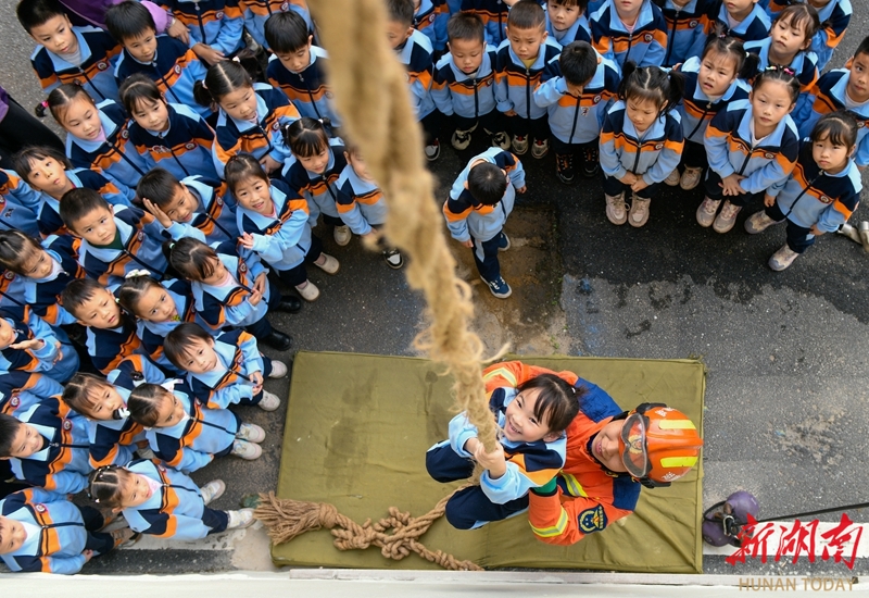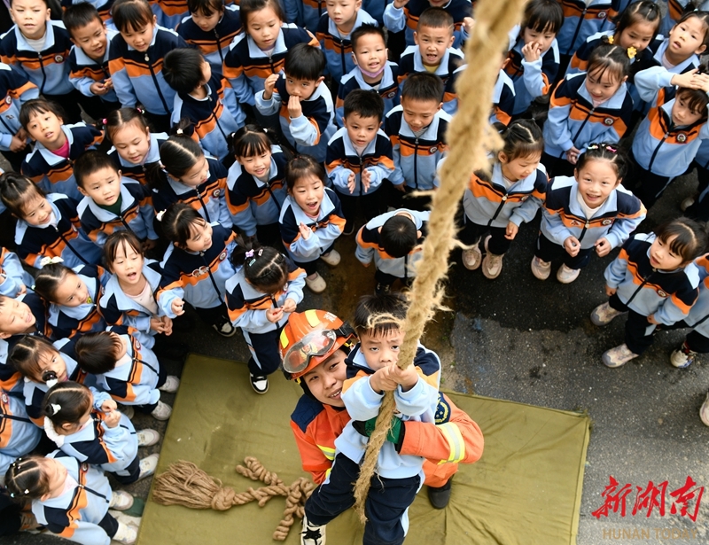 12月2日,小朋友在消防员协助下体验绳索攀爬。当天,道县消防救援大队组织幼儿园小朋友走进消防营区,通过绳索攀爬、水枪操作等互动体验,增强孩子们的安全意识和自救能力。蒋克青 文甜 摄影报道(湖南图片库)