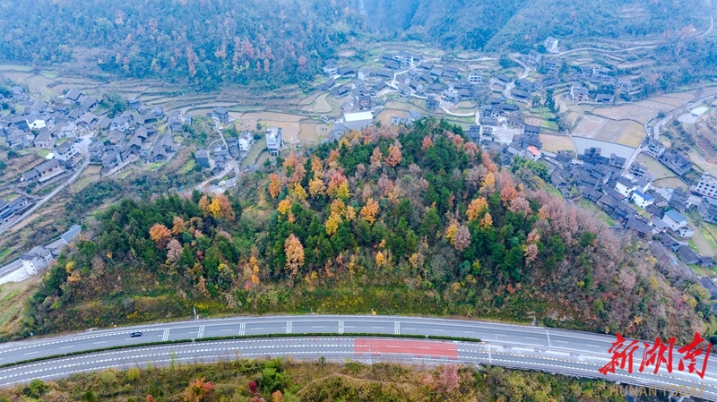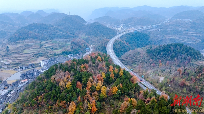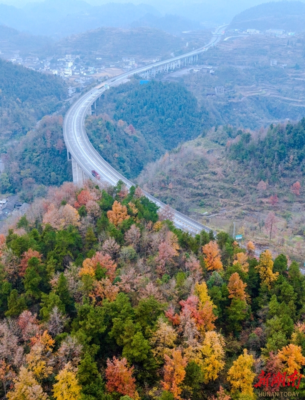 12月2日,吉首市矮寨镇幸福村层林尽染,色彩斑斓,包茂高速公路穿行其间,与古朴的苗寨、缤纷的山林相映成趣,共同构成一幅美丽的乡村冬日画卷。彭璟 摄(湖南图片库)