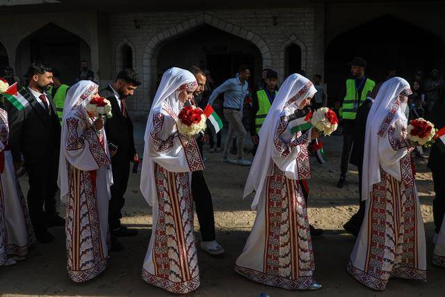 ↑12月2日,在 加沙地带南部城市汗尤尼斯, 巴勒斯坦新人参加集体婚礼。