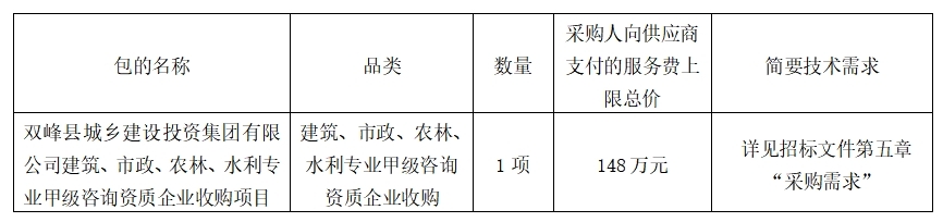 1.项目名称:双峰县城乡建设投资集团有限公司建筑、市政、农林、水利专业甲级咨询资质企业收购项目