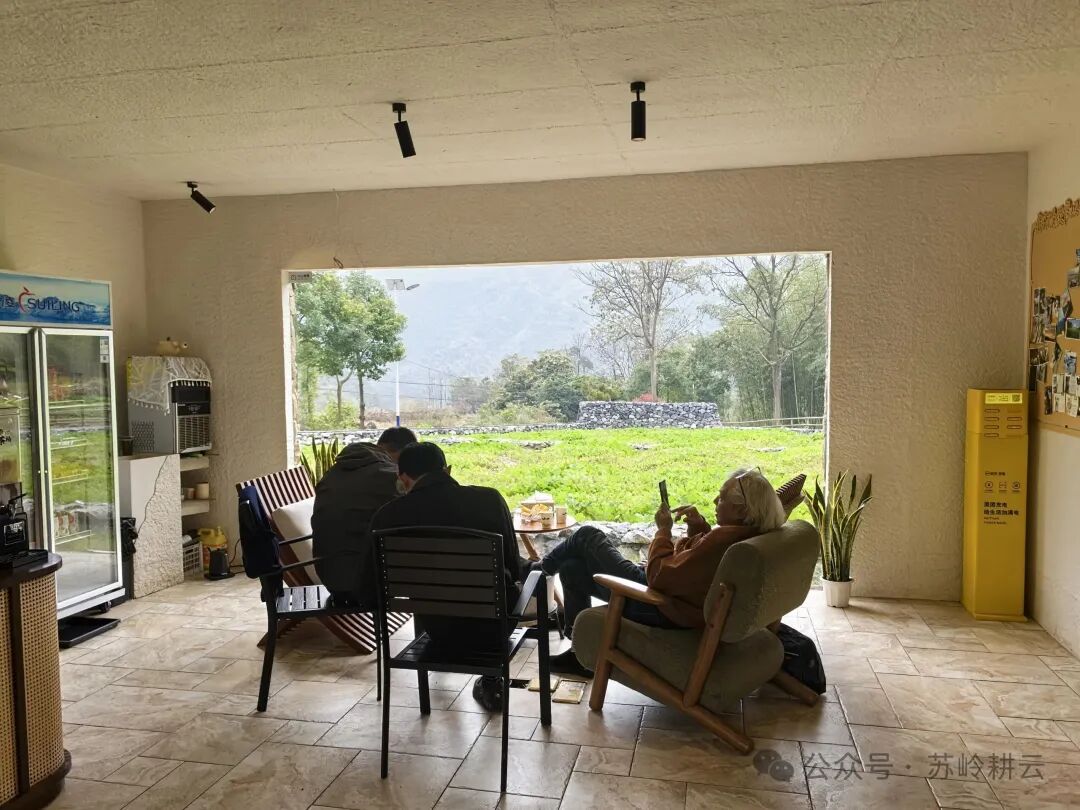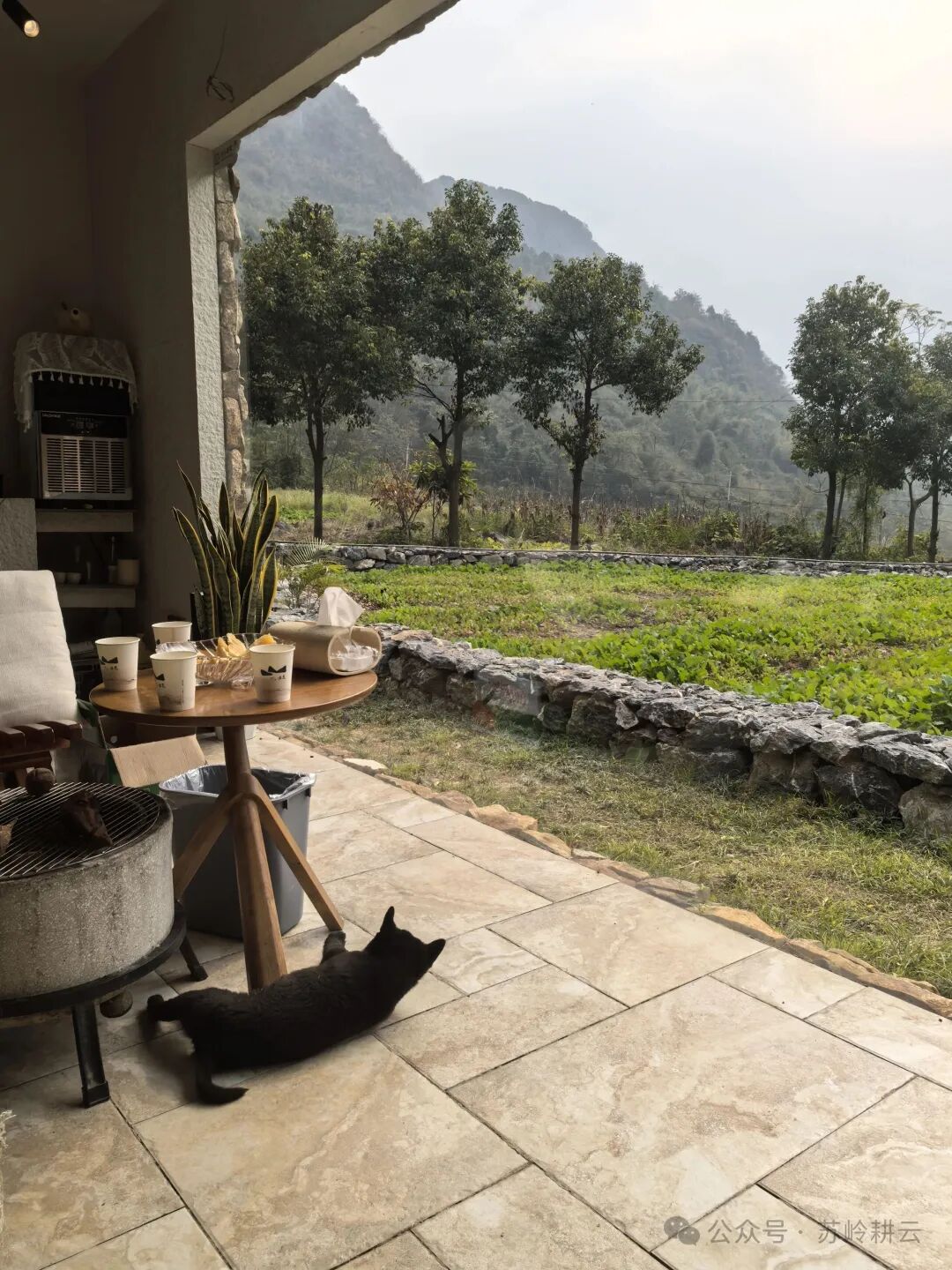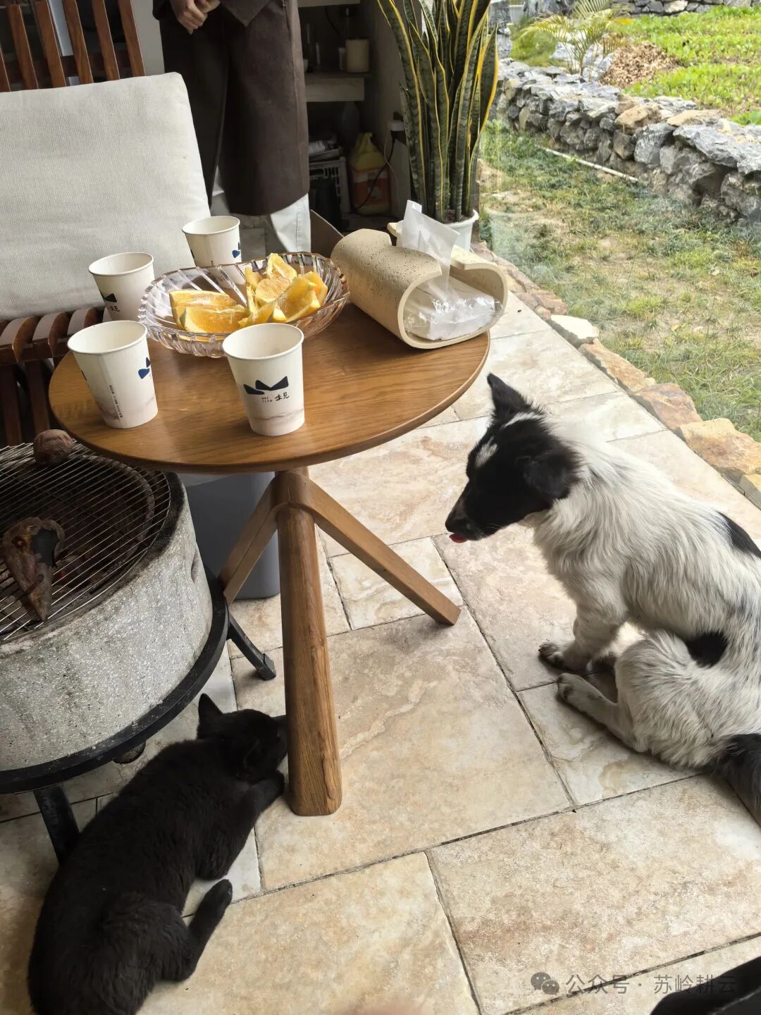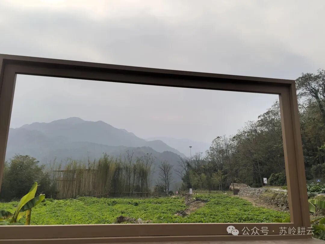 这里的风景是天然的,也是巧妙的,它没有一些网红打卡点的塑料感,只有最和谐自然的构图与着色。即使在雾霭笼罩的初冬,依然美得富有层次和生机。透过大片的玻璃窗,窗外近处的翠绿的白菜、远处的山岚,中间摇曳的树梢,都像一幅冬天的文人山水画……难怪说大自然就是最好的艺术家。室内,点着火炭,烤着红薯、棉花糖,室外就是天然画,冬日阳光、温馨炉火旁是打盹的小黑……
