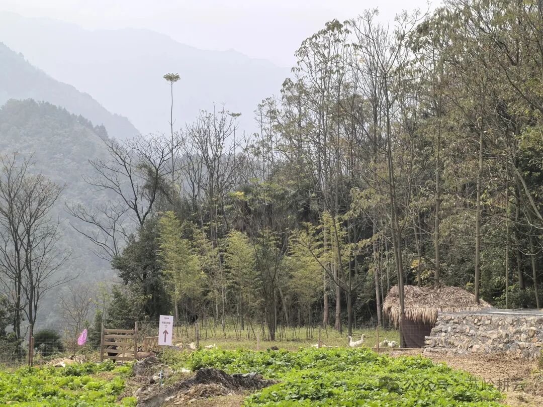 一路上,我们经过民宿自己种的新鲜蔬菜地、自己养的鸡鸭鹅园,只听鹅叫嘎嘎、鸡鸭争嚷,伴着对面山上的翠树峰林,忽然想起陶渊明的“狗吠深巷中,鸡鸣桑树巅”。难怪餐桌上的菜肴新鲜可口,原来都是自己种自己养的生态菜肴。