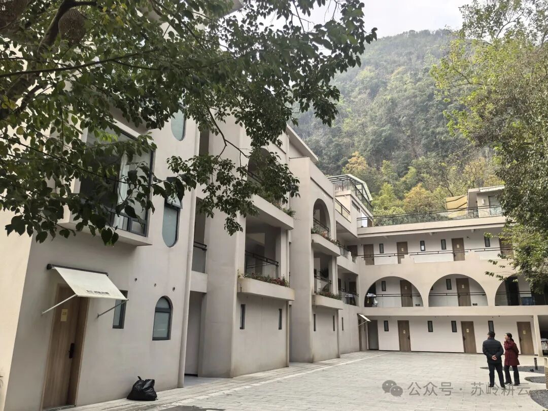 它坐落在山的脚下,灰白的主色、几何的线条、小阳台绽放的鲜花,玲珑静美,那背后的山奇峰逶迤、像是一座天然的山水屏风。