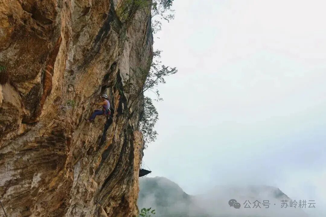 拾阶而上,便见一座悬立的峻崖。其势天成,其险可据,上面有不少攀岩者攀岩用的落点。原来这里是理想的攀岩线路,已经成为诸多攀岩爱好者的心头喜好。为了提升体验感,民宿还开发了悬崖咖啡,用无人机将热咖啡送到平台,供紧张攀岩后的运动者补充能量,深受好评。