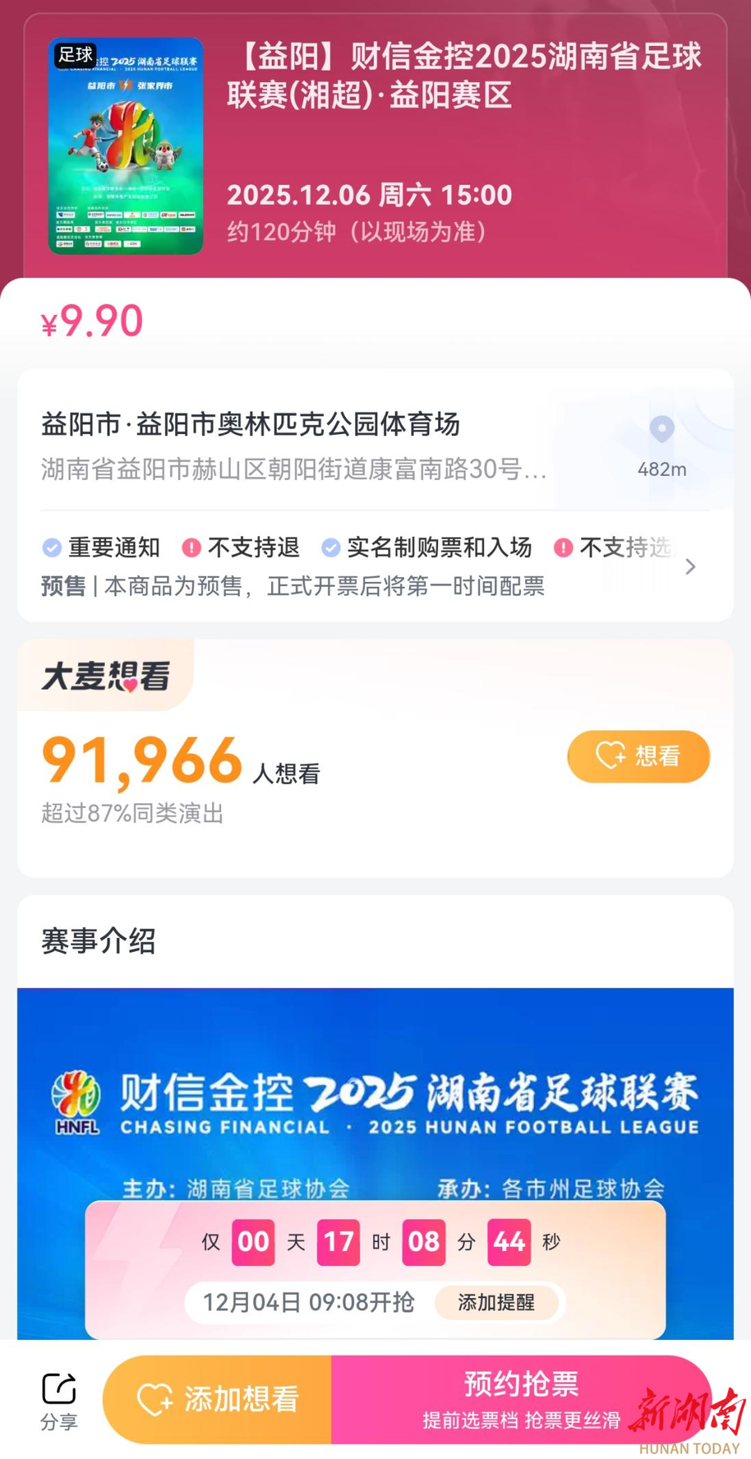 本周六15时,“湘超”益阳队将在主场迎战张家界队。这是一场关乎益阳队能否进8强的最后之战。明天上午定好闹钟,锁定大麦网,09:08抢观赛票。目前已有9万余人“想看”。