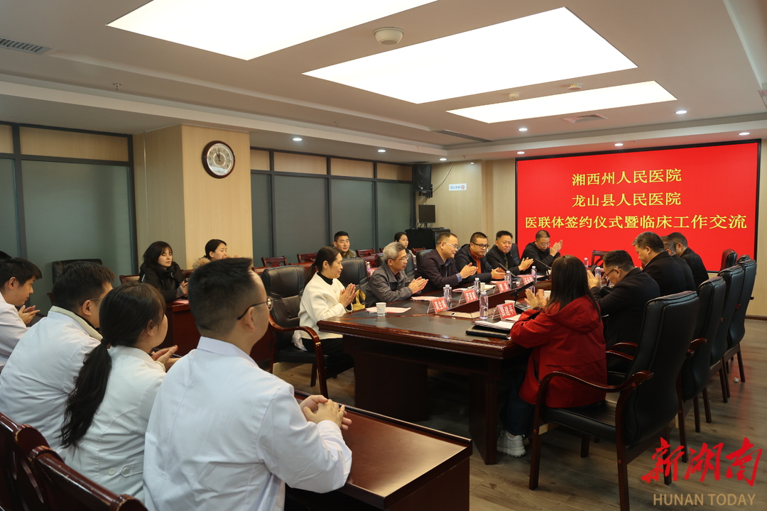 新湖南客户端12月3日讯(通讯员 李钊)12月3日上午,湘西土家族苗族自治州龙山县人民医院门诊六楼会议室气氛热烈,湘西州人民医院与龙山县人民医院医疗联合体签约仪式暨临床业务工作交流会在此举行。湘西州人民医院副院长贾浩、龙山县卫健局副局长贾岩生、龙山县人民医院院长彭涌及医院相关职能部门负责人、临床科室主任参加签约。