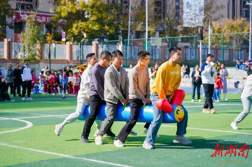 “抬小猪接力赛”更显趣味,家长们在加油呐喊声中,用棍子将一个个可爱的“小猪”安全快速地送至目的地,将气氛推至高潮。