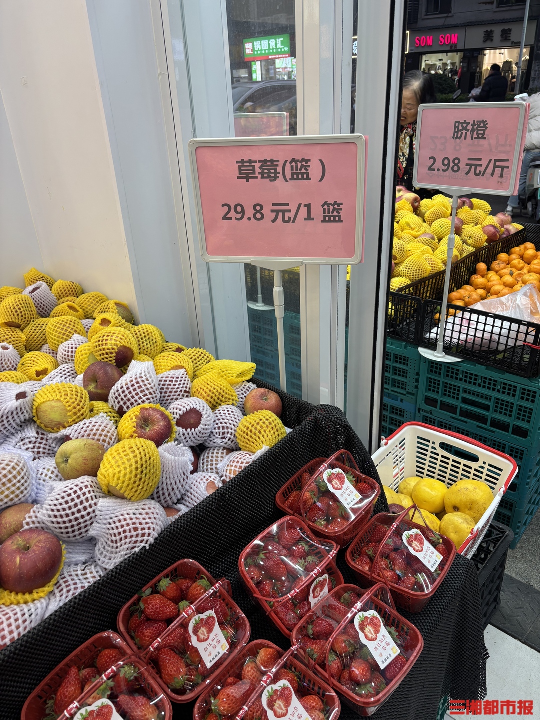 12月3日,果零心选(蔡锷北路店)内,店员将草莓分装在不同篮子中,并摆放在入口处的显眼位置售卖,每篮售价29.8元,内含20至30颗草莓,个头大小略有差异。
