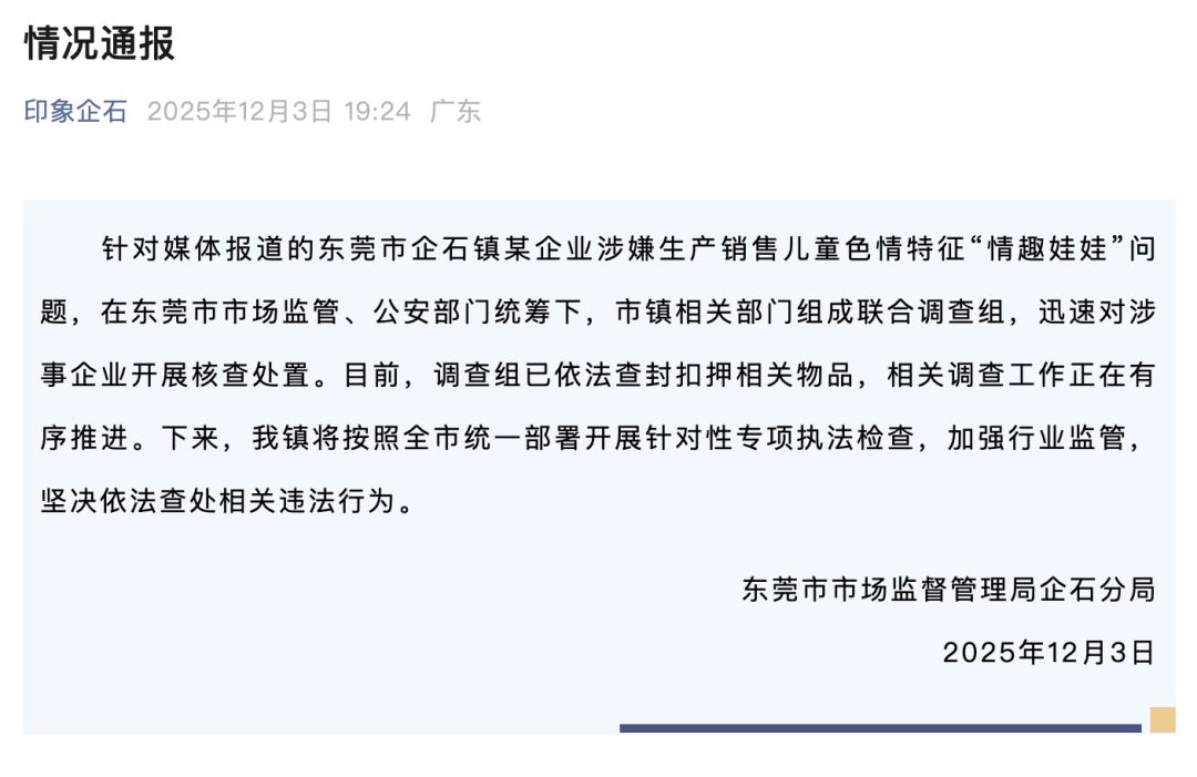 针对媒体报道的东莞市企石镇某企业涉嫌生产销售儿童色情特征“情趣娃娃”问题,在东莞市市场监管、公安部门统筹下,市镇相关部门组成联合调查组,迅速对涉事企业开展核查处置。