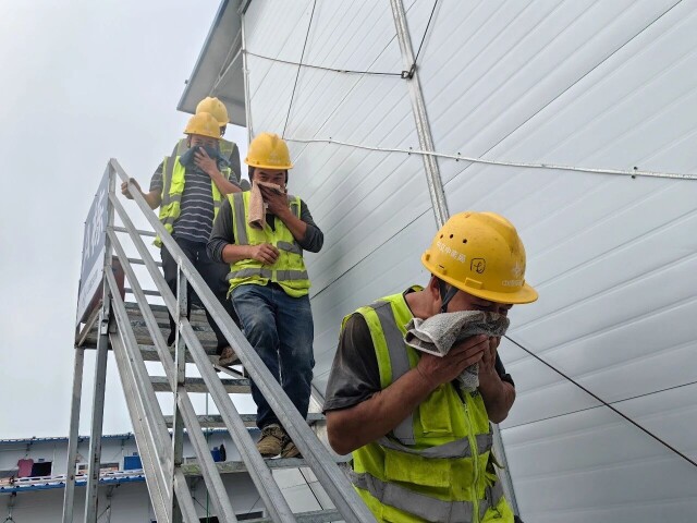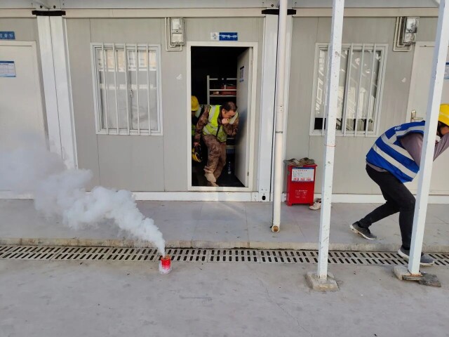 (东莞滨海湾AI智造园项目在工人宿舍开展消防应急演练。)