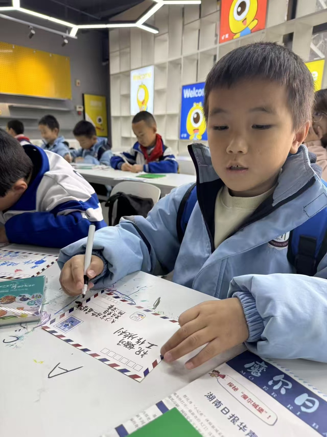 湖湘文化作为一种独特的地域文化,其精神特质主要体现在“心忧天下、敢为人先、实事求是”等方面。在魔尔邮局,同学们不仅可以了解湖湘文化的传承和发展,还可以领到一张“致未来”的明信片。画笔如蝶,在纸上翩翩起舞,“祝自己学习进步”“祝妈妈工作顺利”“明天会更好”,“我们一起努力吧”……稚嫩的文字和简单的配图承载着一切美好。活动当天恰逢2403班温梓琪的8岁生日,“生日快乐”“天天开心”“好运连连”……同学们一封封充满祝福语的明信片,让他喜出望外。无独有偶,三天后即将生日的2404班张珂馨,也用彩笔绘出了一个8层蛋糕,预祝自己生日快乐。