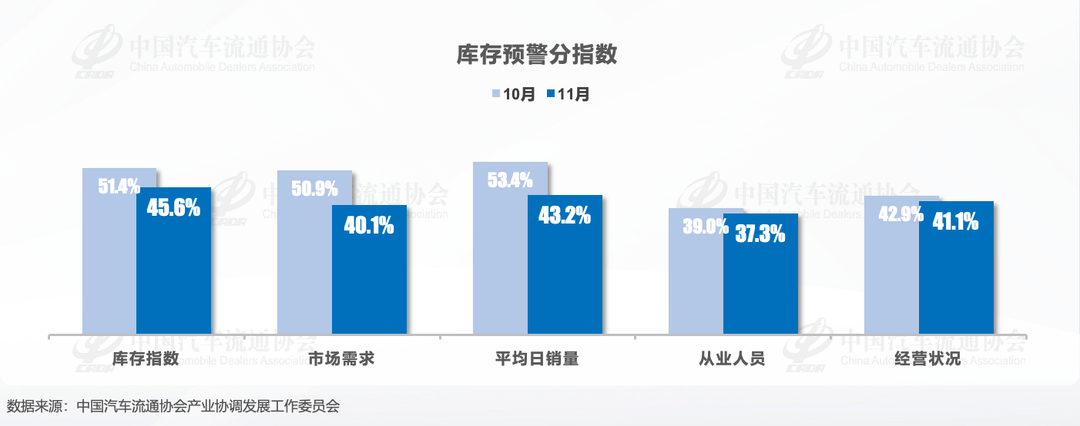 从分指数来看:11月汽车经销商库存、市场需求、 平均日销量、从业人员、经营状况分指数均环比下降。