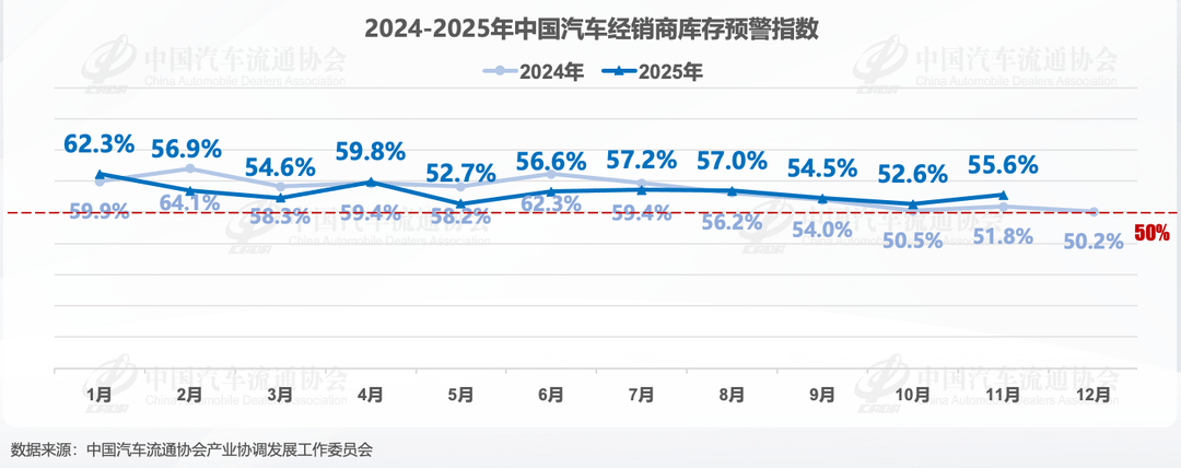 近日,中国汽车流通协会数据显示,2025年11月中国汽车经销商库存预警指数为55.6%,同比上升3.8个百分点,环比上升3.0个百分点。库存预警指数位于荣枯线之上,汽车流通行业景气度有所下降。