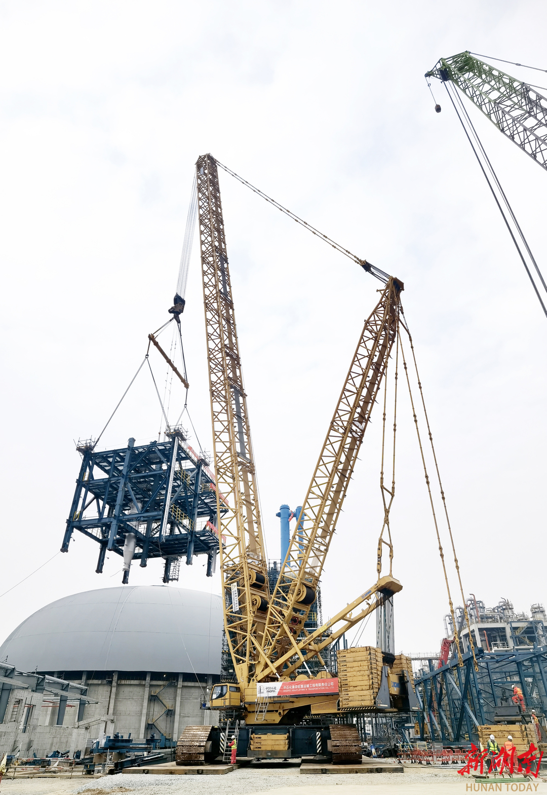 12月2日,湖南石化生物质气化柔性平台建设项目钢结构第二段模块23.4-37.4米段吊装场景。
