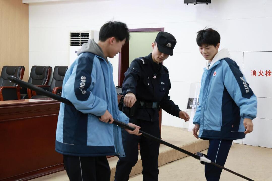 “这是防暴盾牌,主要用于防护......”法警耐心讲解着各种警用器械的功能和使用场景。不同于往常的单纯讲解,在法警的专业指导下,同学们获得了亲手体验部分器械的机会。通过这种沉浸式互动,抽象的安全知识转化为真实的感官认知,让同学们在操作中切实体会到司法警务工作的严谨与专业。