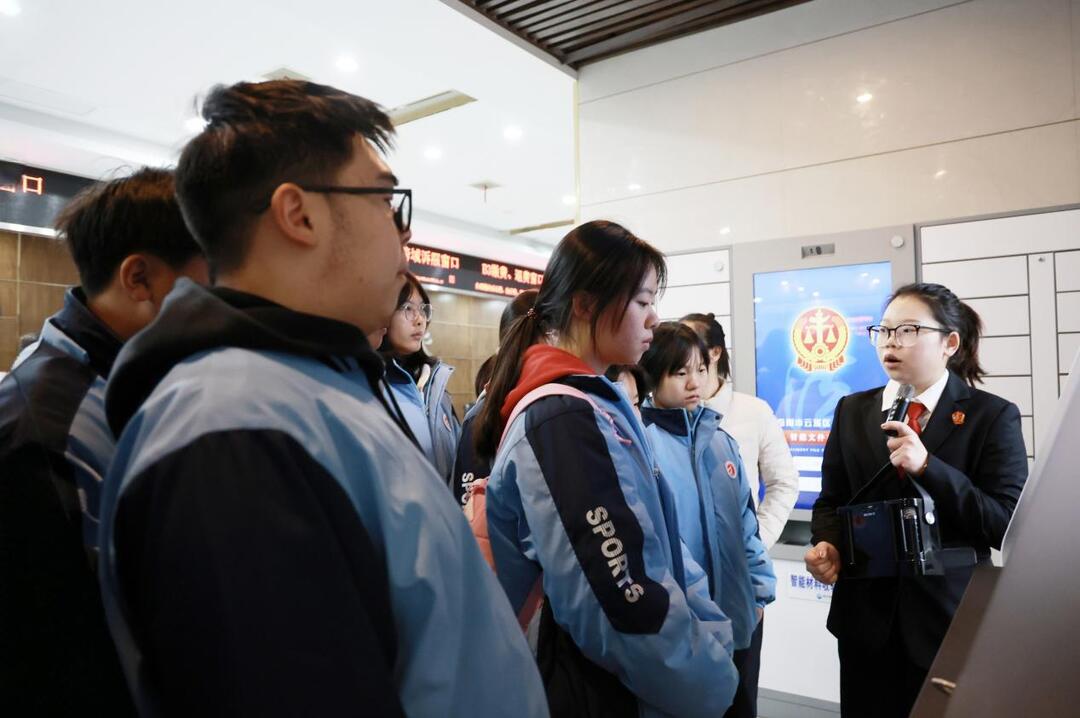 在法院干警的引导下,同学们参观了诉讼服务中心、法治文化展厅、智慧法庭、羁押室、清廉文化园地、少年法庭、院史室等场所,对法院的职能布局与日常工作形成了直观而具体的认识。