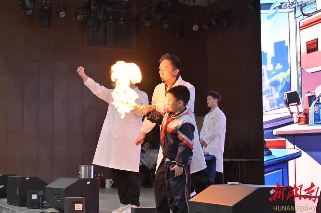 活动伊始,主持人以“仰望星空的浩瀚”与“脚踏实地的探索”为引,生动阐述了科技对生活的改变,提及“祝融探火”等重大科技成就时,瞬间点燃了现场师生的探索热情。随后,精彩纷呈的环节依次展开:机器狗与智能机器人率先登场,灵活的动作、默契的互动,让同学们近距离感受了前沿科技的神奇魅力,现场惊叹声此起彼伏;科学秀《冰与火之歌》更是将活动推向高潮,液氮的极寒与火焰的热情激烈碰撞,奇妙的视觉效果让同学们目不转睛,在惊叹中直观理解了科学原理;最后,科普剧《永恒的星辰:陈能宽》带领师生走进科学家的世界,通过生动的演绎,让大家深刻感悟到陈能宽院士为祖国科技事业奉献的“星辰精神”,不少同学深受触动。
