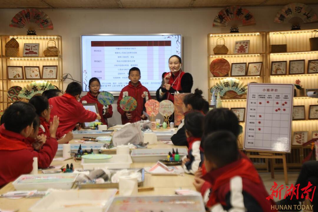 与会人员实地参观了学校“润美楼”非遗劳动教育基地“一园五坊”,沉浸式观摩了漆扇、扎染、布艺、拓印、竹编等非遗项目的学生实践现场。该基地是学校将校本研修成果转化为真实育人场景的重要载体,融合非遗传承、劳动锻炼、审美培育与品德养成于一体,成为“五育融合”可感、可知、可践行的生动课堂。
