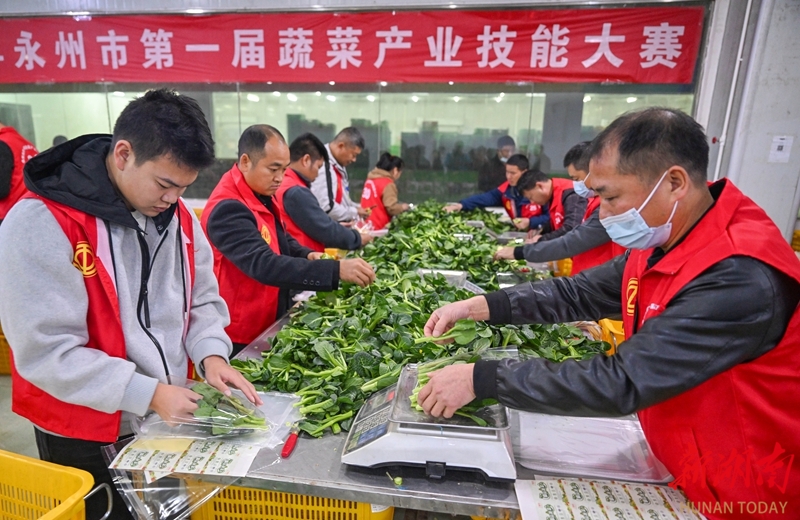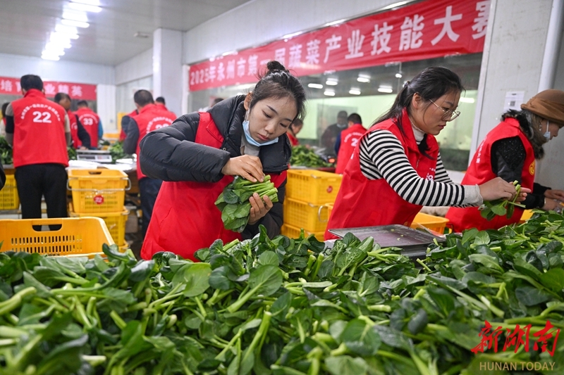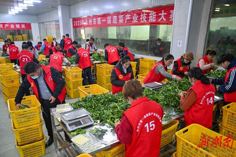 12月5日,参赛选手在车间进行蔬菜分拣包装项目比拼。当天,永州市第一届蔬菜产业技能大赛在新田县东升农场拉开帷幕。来自全市各县市区的100余名选手展开“指尖对决”——菜心采摘分级、分拣包装两项实操比拼。此次大赛不仅是一场技能切磋,更承载着推动蔬菜产业标准化、品牌化发展的深意。通过以赛促技、以赛育才,助力农民凭技能增收、靠本领成才,为乡村振兴注入新动能。湖南日报全媒体记者 郭立亮 通讯员 刘贵雄 摄影