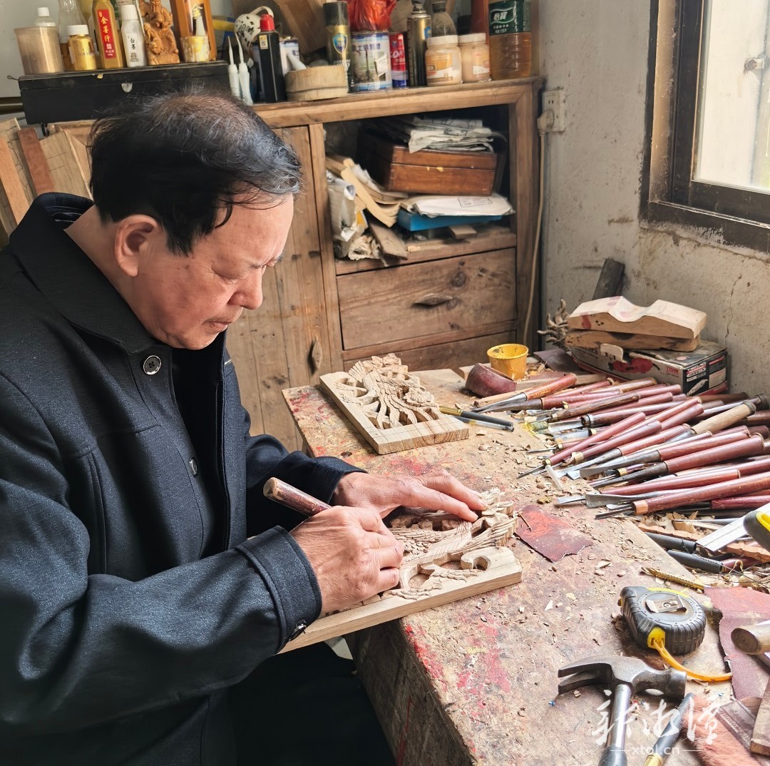 他的题材从不拘泥:梅兰竹菊的清雅,麒麟狮象的祥瑞,神话故事的纷繁……都在刻刀下娓娓道来。为了精进,他拜师系统学习了隐山湖湘雕刻非遗技艺,博采众长。原排头乡文化站站长谢子斌评价他:“脑子活,见识广,钻得深。”