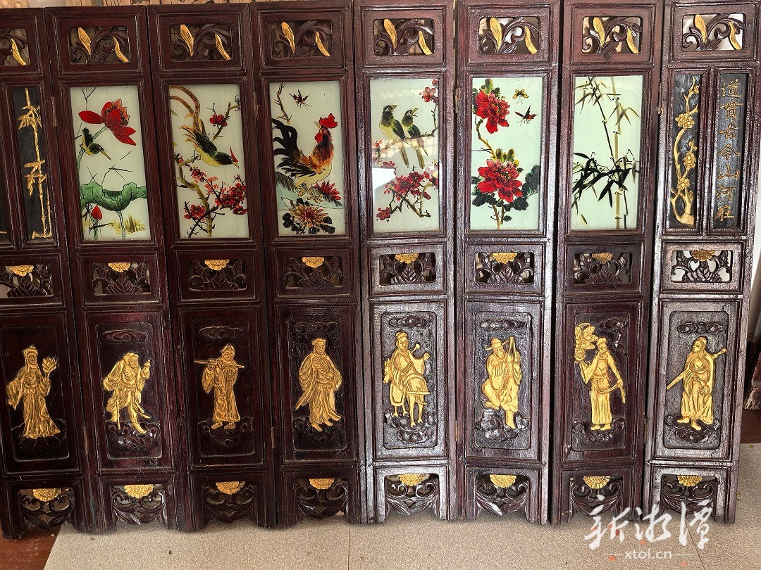 由王米端绘画和雕刻的围屏。(尹义龙 摄)王米端有两个儿子、一个女儿,年轻时候,一家人生活都系于这门手艺。55年来,刻刀与斧凿不仅塑造了木头,也塑造了这个家的轮廓。