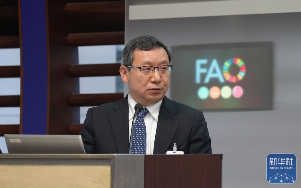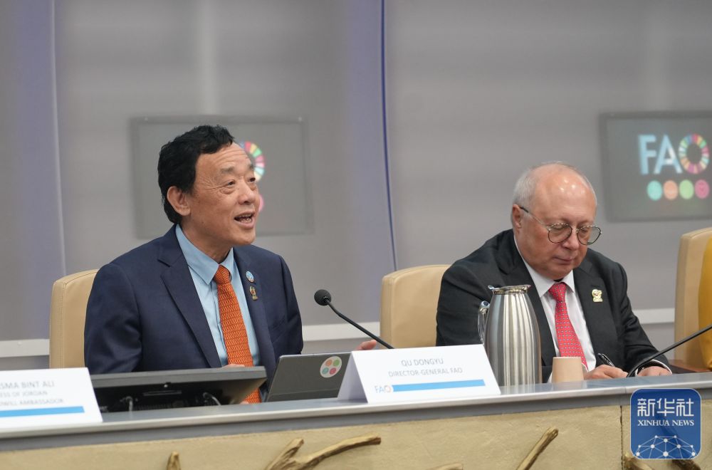 ↑12月5日,在意大利首都罗马,联合国粮农组织总干事屈冬玉(左)在活动现场讲话。