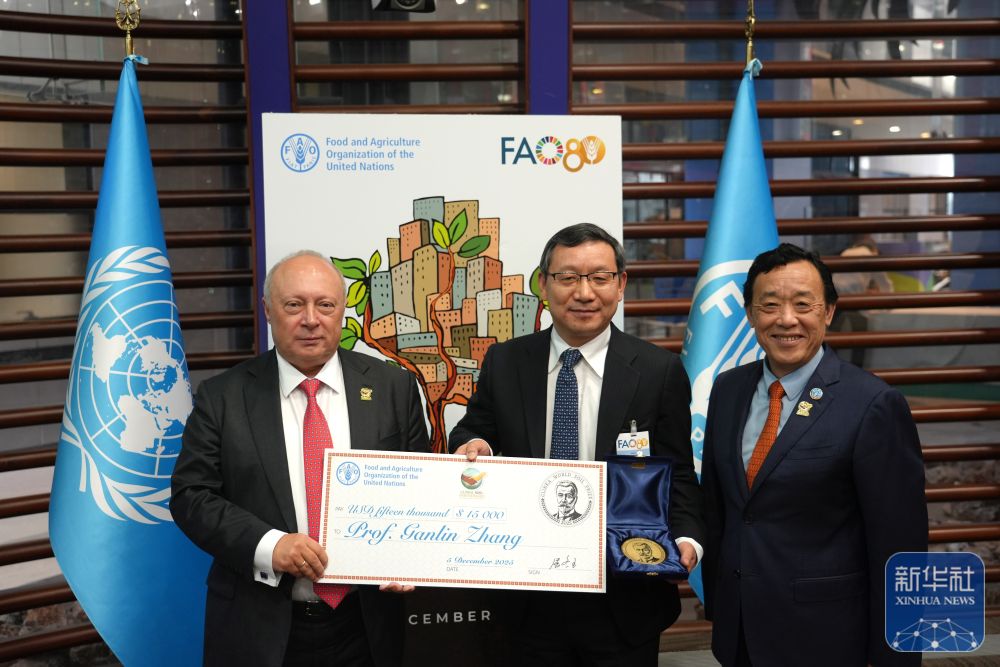 ↑12月5日,在意大利首都罗马,联合国粮农组织总干事屈冬玉(右)向张甘霖(中)颁授2025年格林卡世界土壤奖奖牌。
