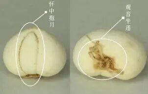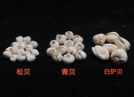松贝,呈类圆锥形或近球形,表面类白色,顶端闭合,有“怀中抱月”(外层鳞叶2瓣大小悬殊,大瓣紧抱小瓣,未抱部分呈新月形);有“观音坐莲”(底部平,微凹入)整体可立于桌面。