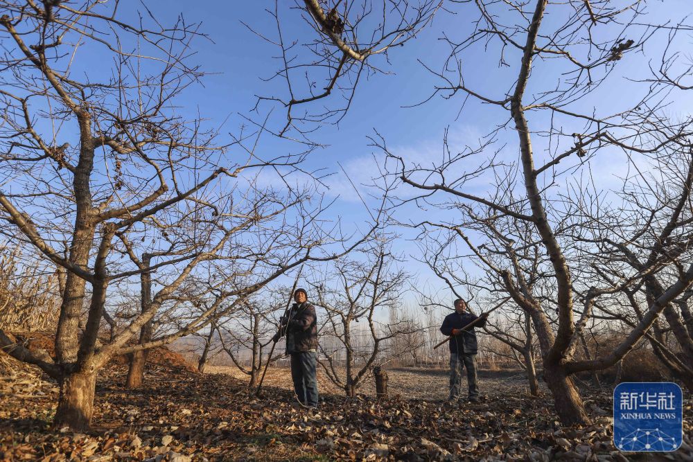 ↑ 12月6日,河北省遵化市刘备寨乡农民为果树剪枝。新华社发(刘满仓摄)