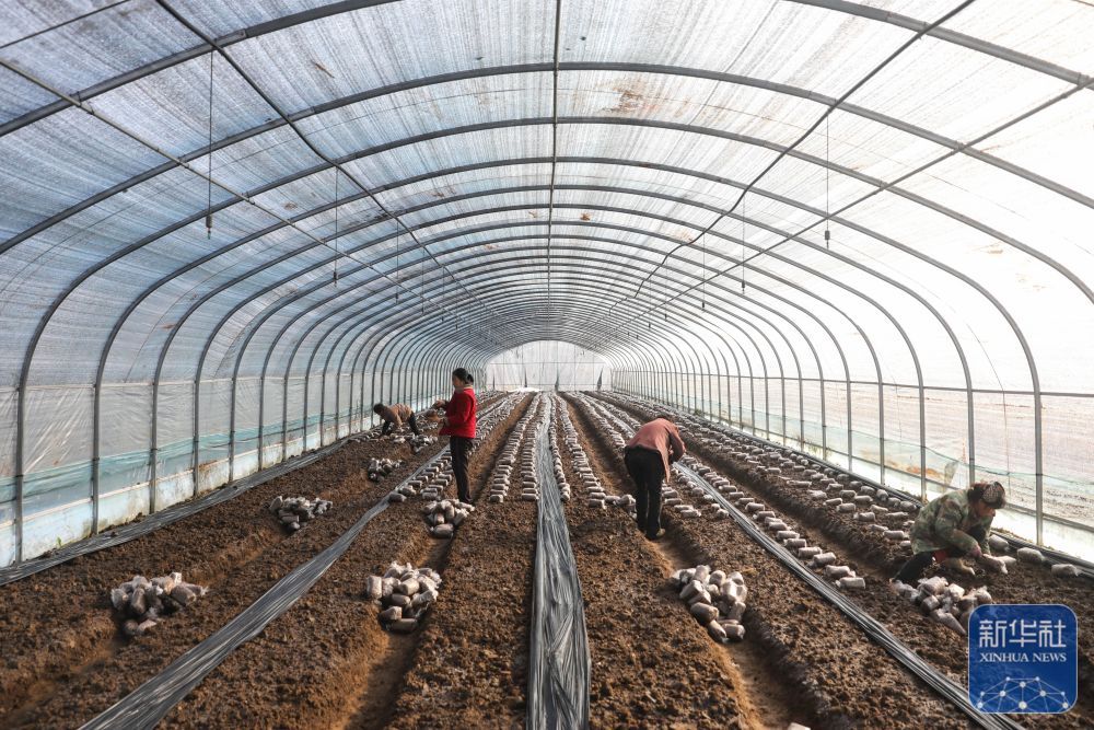 ↑ 12月6日,河南省平顶山市宝丰县闹店镇刘集村农民在大棚里摆放羊肚菌营养包。新华社发(何五昌摄)