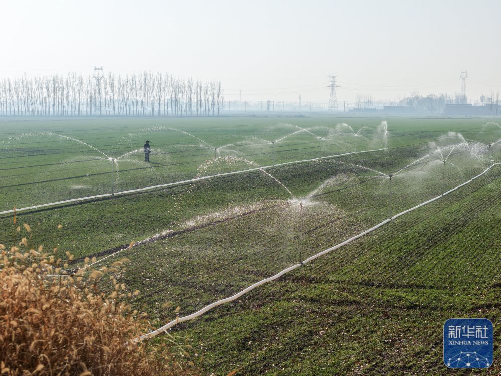 ↑ 12月6日,在山东省聊城市茌平区温陈街道金谷家庭农场,农民使用智能喷灌设施浇灌小麦(无人机照片)。新华社发(马红坤摄)