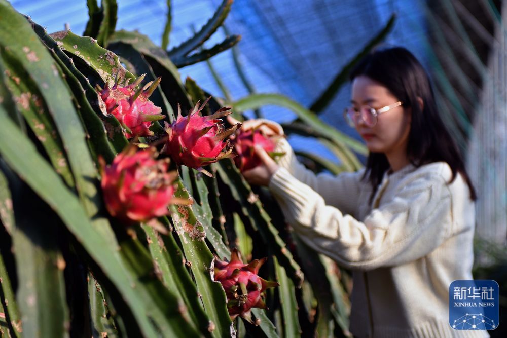 ↑ 12月6日,在山东省烟台市福山区门楼街道,果农采摘火龙果。新华社发(孙文潭摄)