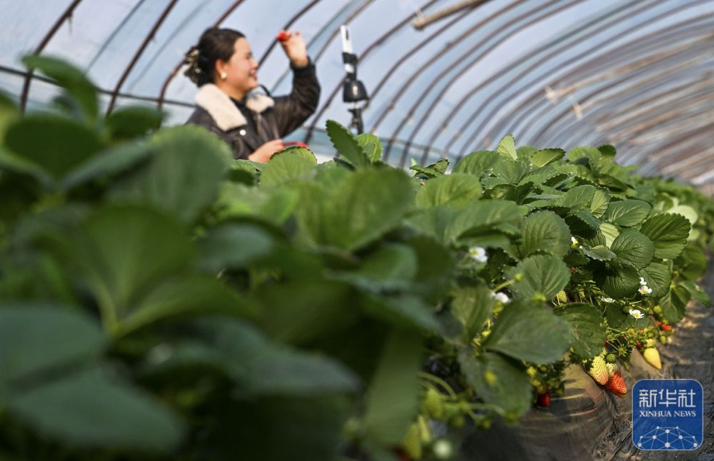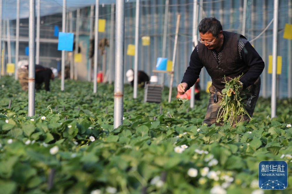 ↑ 12月6日,在山东省威海市文登区文登营镇,工人管理草莓。新华社发(陈宏青摄)
